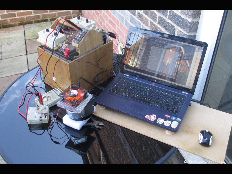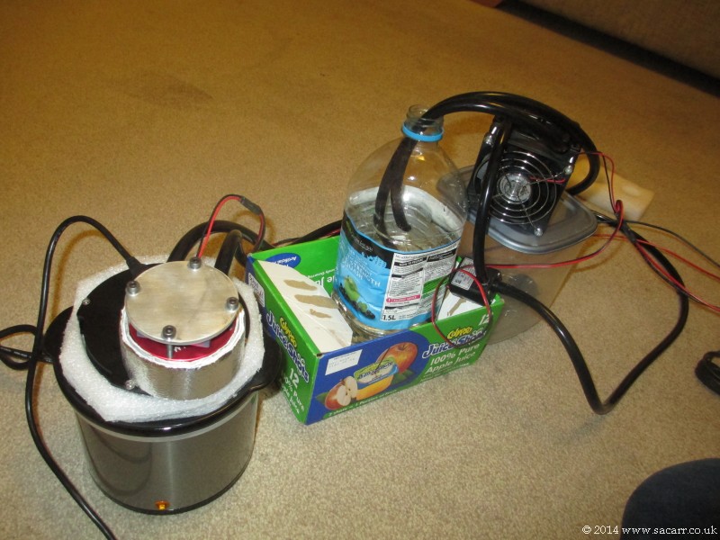 | The water passes through the heatsink and through a fan cooled radiator with a small 12 volt pump to force the water around the system. The picture below right was the first experimental set up with the water cooling, and once again, the sensor temperature dropped significantly, getting as low as 4.5 C. | |