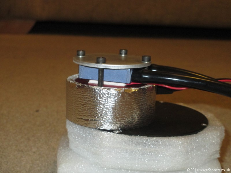 After some long exposure experiments with the ASI on small planetary nebulae, I was quite impressed with the results, but the signal was quite noisy. Cooling the camera would help with the noise, so I decided to experiment. I got a peltier cooler and fan from a friend, who had taken it from a fridge. A heatsink and aluminium block sandwiched the peltier cooler, and this was simply rested on the back of the ASI120 case. The fan was bolted on top of the heatsink and the camera wrapped with three layers of insulation.