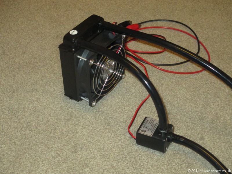 | After the testing was complete, and I was satisfied with the results, I set about to refine the assembly. The camera was re-insulated into a neater form and I created a carry box for the water tank, radiator and pump. This plugs into the 12 volt telescope battery, using one of the LED dimmer circuits to control the peltier temperature. | |