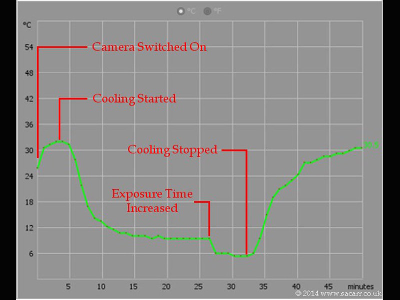 down to a stable 10 degrees running at 10 milli-seconds exposure.