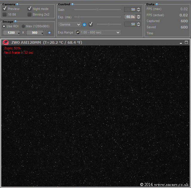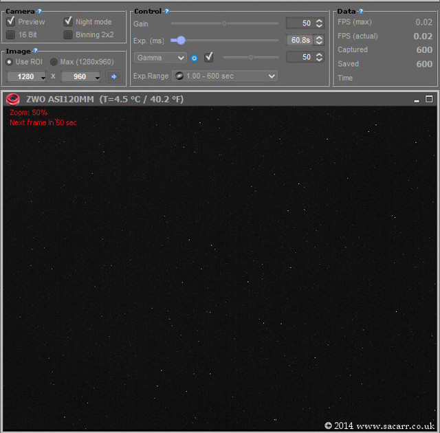 The gain was set at 50%. The more gain the more noise, so I had this set at this average position. The preview window was set to the fastest frame rate and the temperature stayed stable whether the camera was just on preview or capturing video. When the shutter speed was slowed to 1 second exposures, the temperature dropped further to about 5 degrees C. I then tested even longer exposures as would be used for small planetary nebulae. My Deep Space tests have so far ranged from 2 to 16 seconds, but I had no doubts I would be going longer. So the next test was with the exposure set to 60 seconds. Since the camera was already cool, I shot the cooled test first, which was at 4.5C, then switched the cooling off, and let the camera temperature rise to 20 degrees. The two images below show the difference in noise between the two temperatures. This will give significant improvements in captures for long exposure settings. |