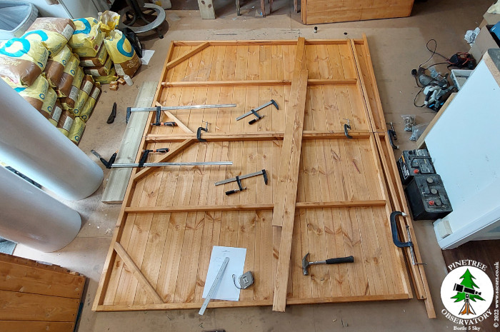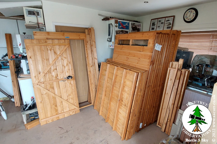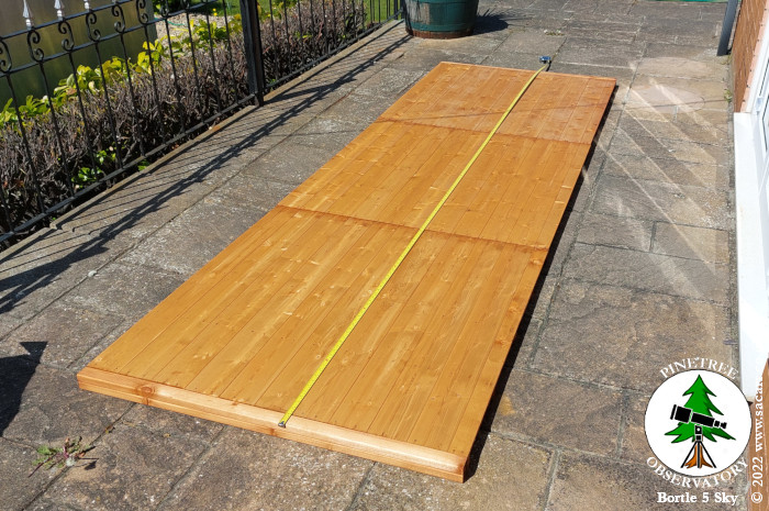 This end panel goes closest to the garden shed and garage and faces East North East. The aluminium rulers mark the roof runner position, while the two pieces of timber at the top of the picture show the top of the roof. The sides of the roof panels will be about 12 inches tall. The green foam tube represents my 200PDS scope. The front wall of the roof section will open upwards to allow the roof to slide down the tracks and clear the