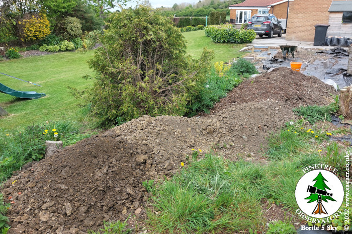 The spoil heap from all the digging and clearing is 23 feet long, 2 to 3 feet high and about 5 feet wide! This will go into leveling the land beyond the observatory where we plan a second lawn and a 1/1 scale railway garden feature!