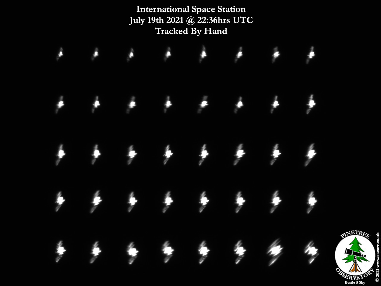Space Station While still daylight, I also saw the ISS pass over, though it wasn't shown on the Clear Outside website at that time. I knew it would be back in 90 minutes, so got ready for the next pass, to try a capture. With the ASI178 on full sensor, I pressed record, released the EQ mount clutches and tried to hand guide through the finderscope, which of course is a reversed image! The results were a bit over exposed, but recognisable. Not my best ISS, but the most captures on a single pass! - 19-07-21 |
