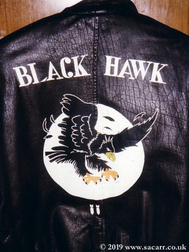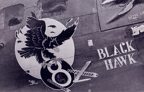"Blackhawk" is adapted from a 96th Bomb Group B-17. The original design can be seen in the picture below. The name was moved to the shoulders and the "8 Ball" turret omitted.