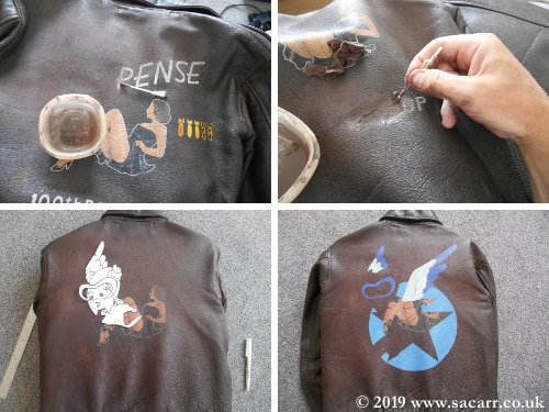 "Fifinella" is the new name on my first, size 36 chest, A-2 Jacket. I outgrew it long ago, so the jacket is moving on to a friend. She wanted the Womens Airforce Service Pilots logo which required some of the old artwork to be carefully stripped off before repainting.