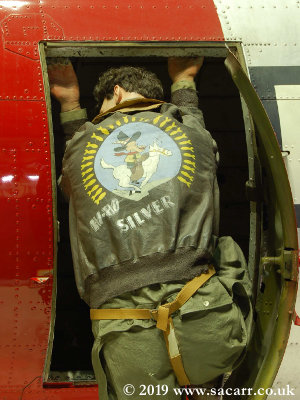 "Hi Ho Silver" is copied from a wartime A-2 jacket. The original picture was B&W, so an RGB colour chart was turned to greyscale to estimate colours, the rider against the setting sun. The other example is at RAF Hendon, and used different colours.