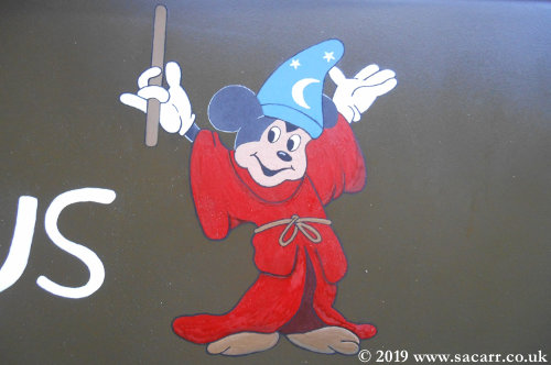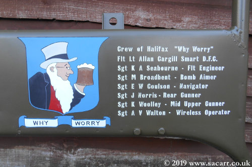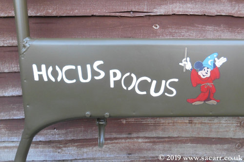 This Jeep has dual artwork. On the left side of the screen when looking from the front, is the "Hocus Pocus" artwork, a name carried by the Jeep when purchased by the current owner. The right side is a tribute to the crew of Halifax "Why Worry". |