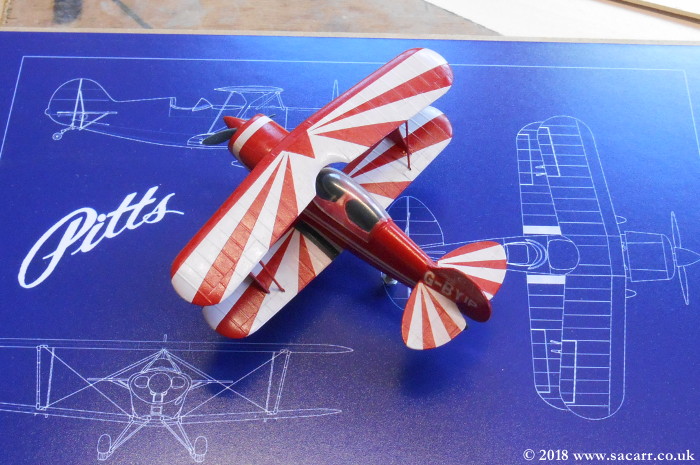 This 1/48 scale Pitts Special has a scratch built one piece bubble canopy enclosing both cockpits and a custom colour scheme.