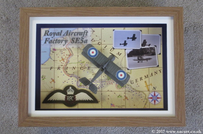The SE5a is mounted over a graphic of the WW1 frontline and includes some reproduction embroidered RFC wings.
