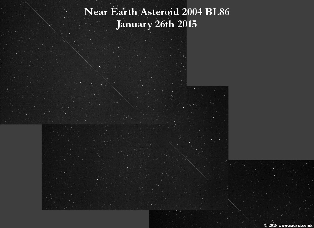 This picture is a mosaic covering a larger area of sky. The gaps in the trail are where I had to reposition the scope to stay ahead of the fast moving asteroid.