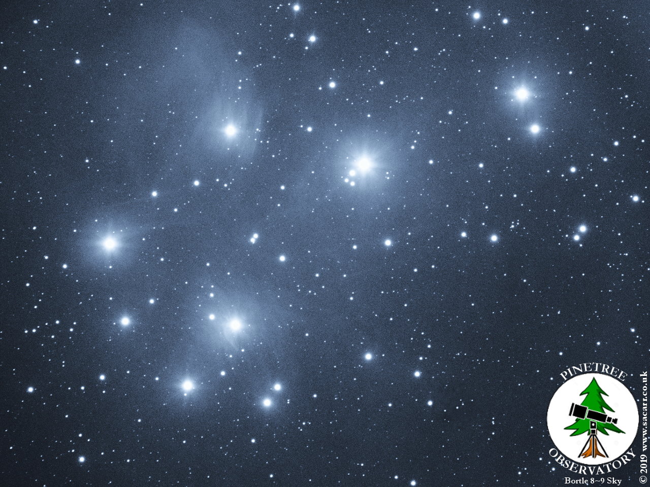 M 45, 13 x 5 minute exposures at ISO 400. The dark area at the bottom of this image is probably due to the off axis guider being too close to the camera sensor.