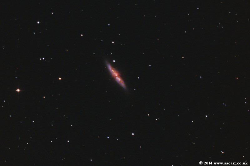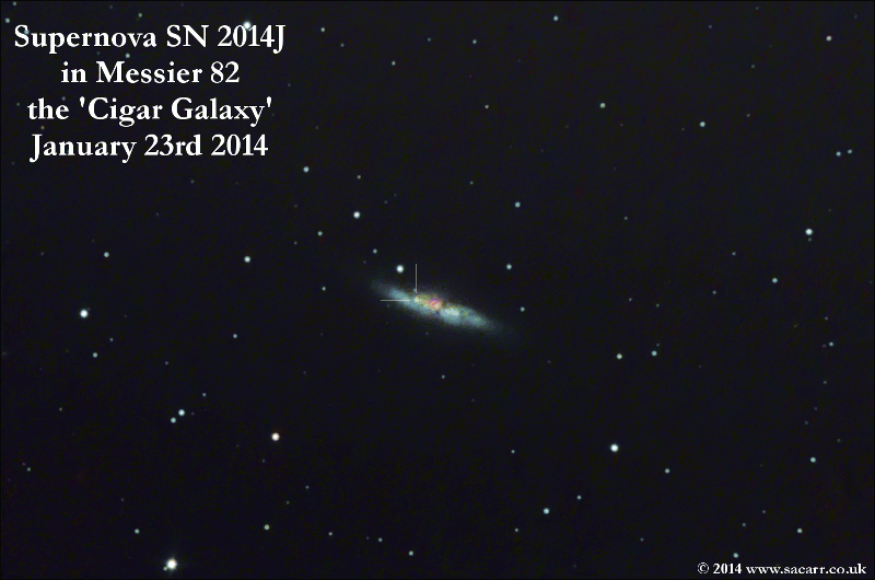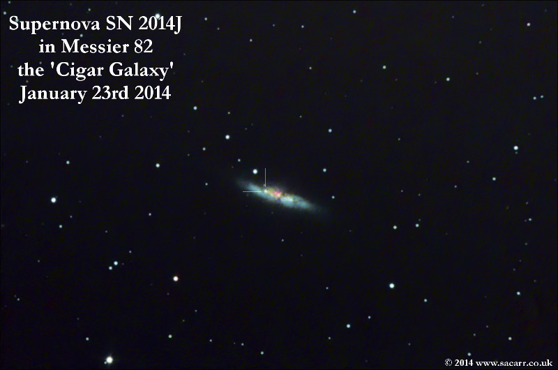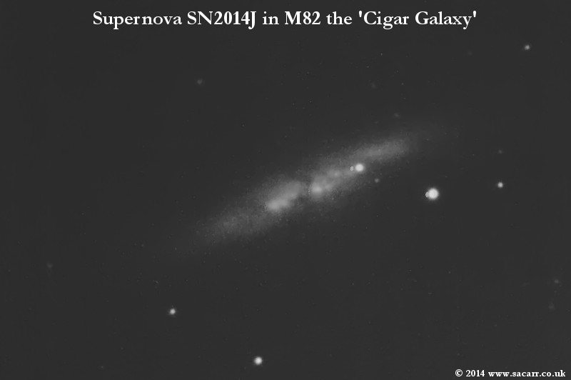 M 82 and Supernova SN2014j - 3 hours in 2 minute ISO 800 subs on January 23rd 2014.