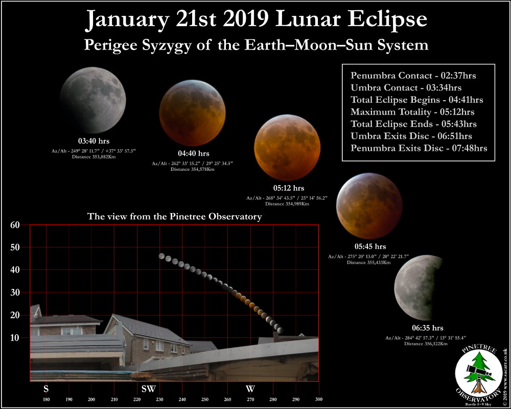 2019 Lunar Eclipse The evening of the 20th started out cloudy and raining. It didn't bode well for the Lunar eclipse in the early hours of the 21st. As the evening moved towards the last few hours of the day, the clouds began to thin, the rain stopped and the clouds eventually cleared. As soon as the rain stopped, I opened up the observatory, set up the camera and got everything ready. Once it cleared, I did a few test shots and some video to produce a full Moon shot before closing up the observatory roof. From