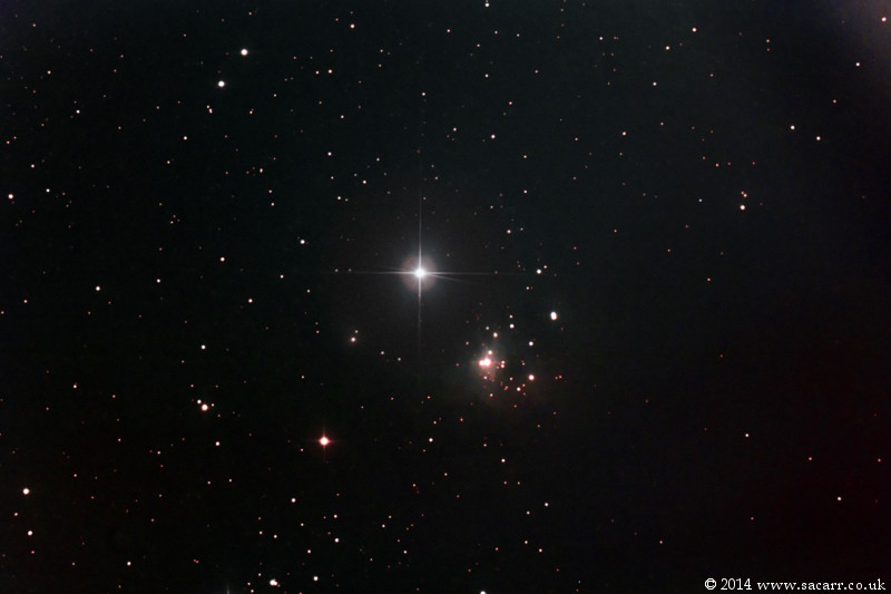 This is a 2 hour image, taken in 5 minute exposures at ISO 800, and for the first time, testing a borrowed Astronomik UHC filter. Stacked with Darks, Flats and Bias frames. It was taken early in the evening when the target was still fairly low. This region is located in Perseus about 1028 Light Years from Earth. It combines nebulosity and a 2 million year old cluster of about 400 stars. About half of the stars in the cluster have a circumstellar disk, of which 60% are primordial disks. 23-11-14.