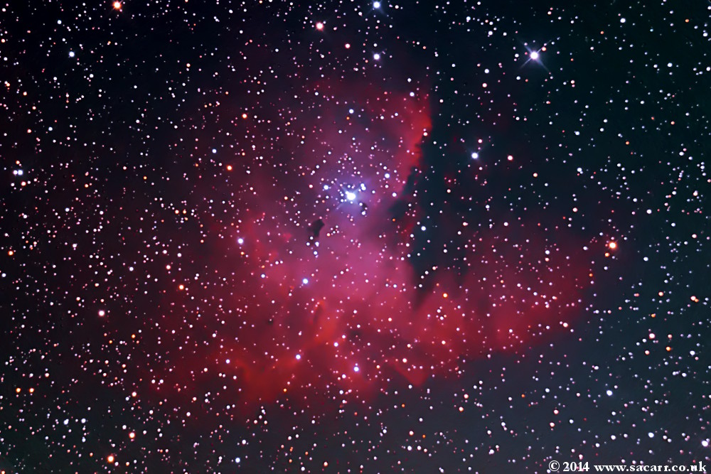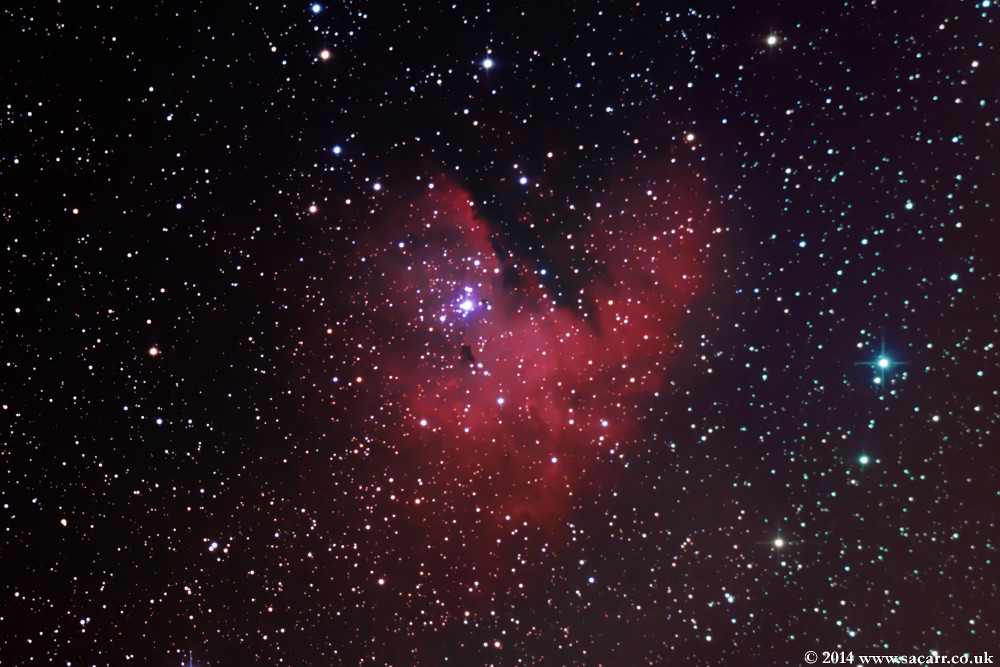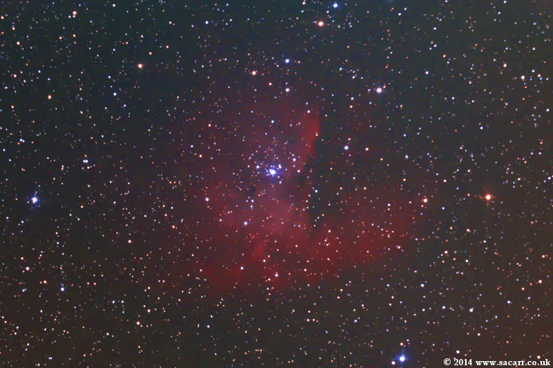 Almost 8 Hours of 3 and 5 minute exposures, ISO 800 with the Canon. 25/26-09-14. NGC281 is 9500 light years from Earth. When the light left this nebula heading for my scope, settlements at Sand and Applecross on the coast of Wester Ross, in Scotland, were constructed. About the same time, hunter-gatherers were the first humans to reach Ireland.