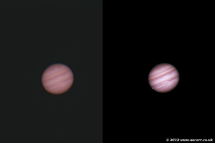 ![]() Webcam image using x2 Barlow and stacked in Autostakkert with a 1.5 Drizzle. The image to the left is before processing in Registax, and on the right after using the Wavelet functions |