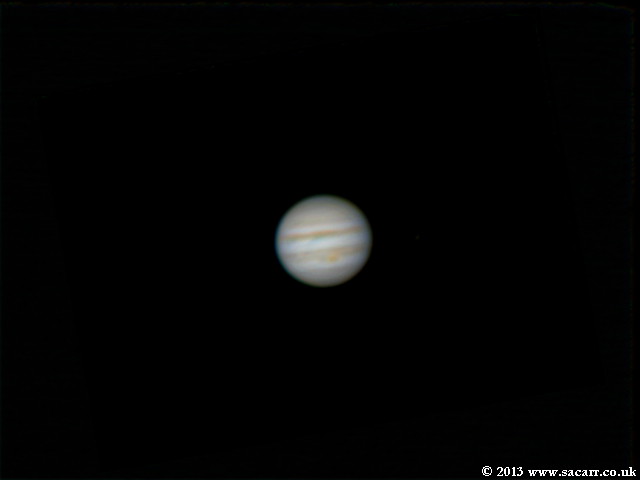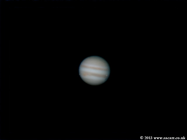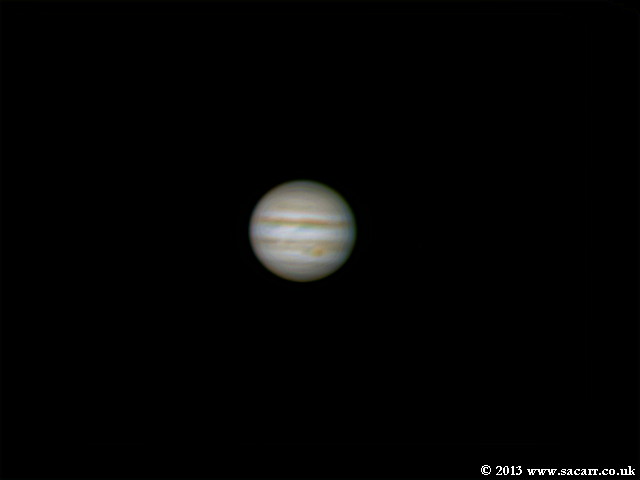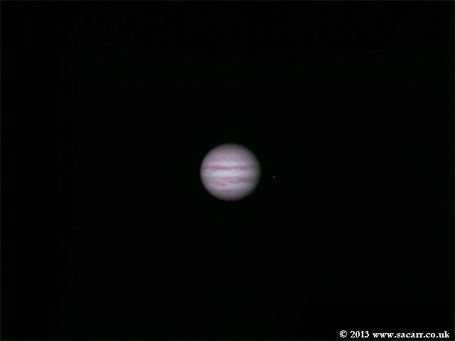 After the double shadow transit, as Jupiter rose higher in the sky, the seeing improved, not brilliant, but better. From around midnight, the Great Red Spot drifted into view and I started to shoot AVI's until 2:20am, 30-09-13