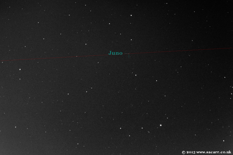 3 Juno, I think. Its position doesn't quite match the position shown in Stellarium, but at magnitude 9.58, it should be virtually the same brightness as the end star in the 'V' of stars just above it, which is magnitude 10.65. There was nothing that bright in the correct location, but near by was the light point marked above, which didn't show in Stellarium, so I'm guessing that this is Juno. Unfortunately the weather won't allow a comparison picture within the next week - 10-06-13 |