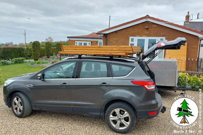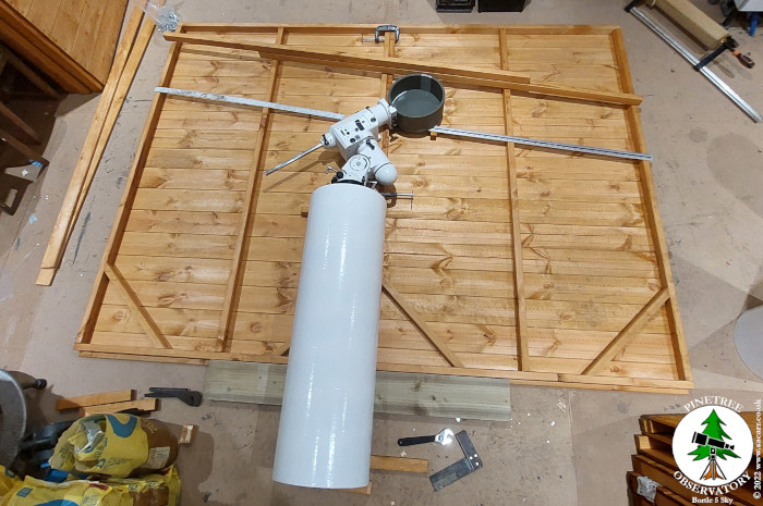 This end panel goes closest to the garden shed and garage and faces East North East. The aluminium rulers mark the roof runner position, while the two pieces of timber at the top of the picture show the top of the roof. The sides of the roof panels will be about 12 inches tall. The green foam tube represents my 200PDS scope. The front wall of the roof section will open upwards to allow the roof to slide down the tracks and clear the
