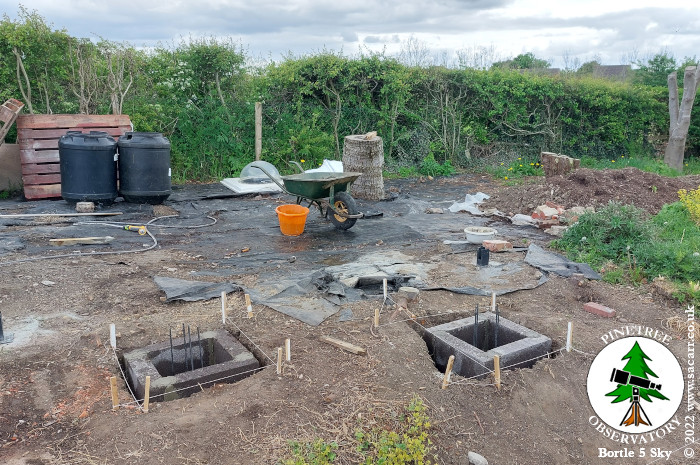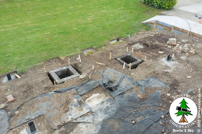 The second view of the two foundations is looking approximately South. The way the piers are staggered gives them both a good view South and gives me my small warm room space in the left foreground. The right pier will be for solar system targets while the left will be for deep sky.