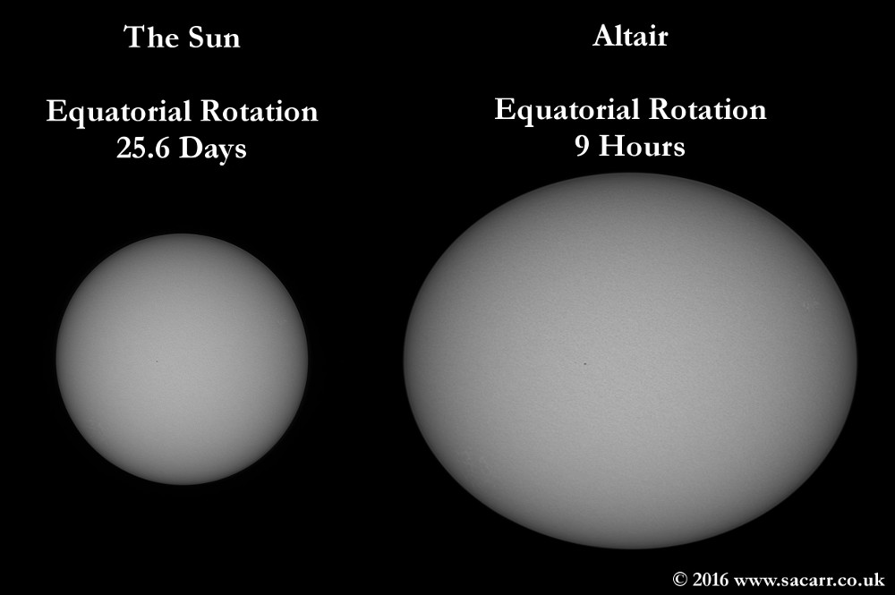 Altair is around 1.8 x the mass of the Sun, but it rotates very quickly. Where the equator on the Sun takes around 25 days to complete one revolution, the Equator on Altair does one rotation ever 9 hours, a speed of 286Km/sec. This is around 72% of the speed necessary for the break up of the star. This very fast rotation flattens out the star, causing the equatorial diameter to be 20% larger than the polar diameter! This also cools the star at the equator ( search the net for 'gravity darkening' ). I used my Sun shot from November 1st, and enlarged and distorted it to create a comparison between our Sun and Altair to show the difference. Wiki says the radius is 1.63 to 2.03 x the Sun's radius, so I've gone for half way between for my example.