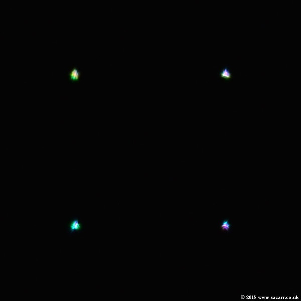 8.6 light years away and magnitude -1.45. 1/80th second, ISO 200. The four single shots show some of the many colours of Sirius. Below this is a video of Sirius shot with the Nikon D3200 through the Evostar 80ED and 2x teleconverter. 14-03-15