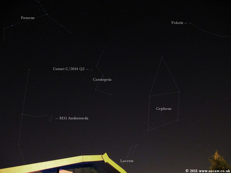 Cassiopeia, Andromeda, Cephus A single widefield shot with a Canon compact camera set to 15 seconds exposure - 08-03-15