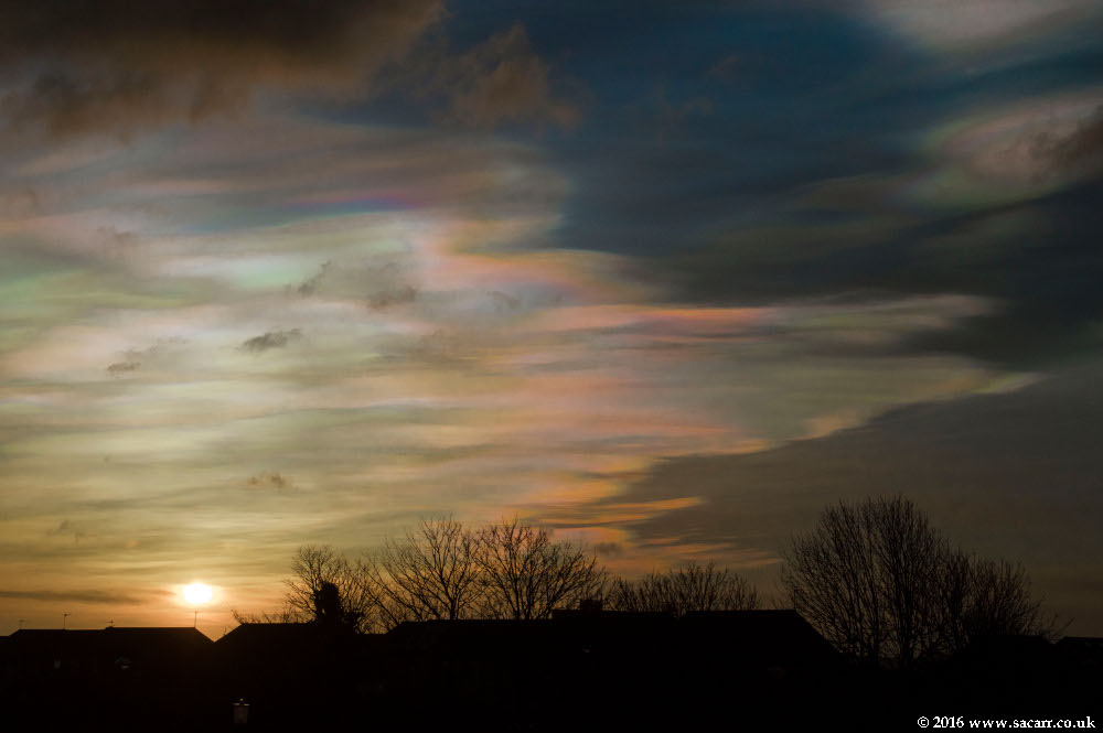 Polar stratospheric clouds, also known as nacreous clouds, are clouds in the winter polar stratosphere at altitudes of 49,000–82,000 ft. They are best observed during twilight when the sun is between 1 and 6 degrees below the horizon - 02-02-16.