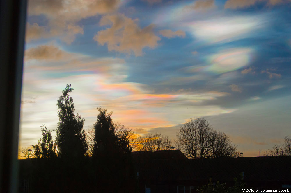 Polar stratospheric clouds, also known as nacreous clouds, are clouds in the winter polar stratosphere at altitudes of 49,000–82,000 ft. They are best observed during twilight when the sun is between 1 and 6 degrees below the horizon - 02-02-16.