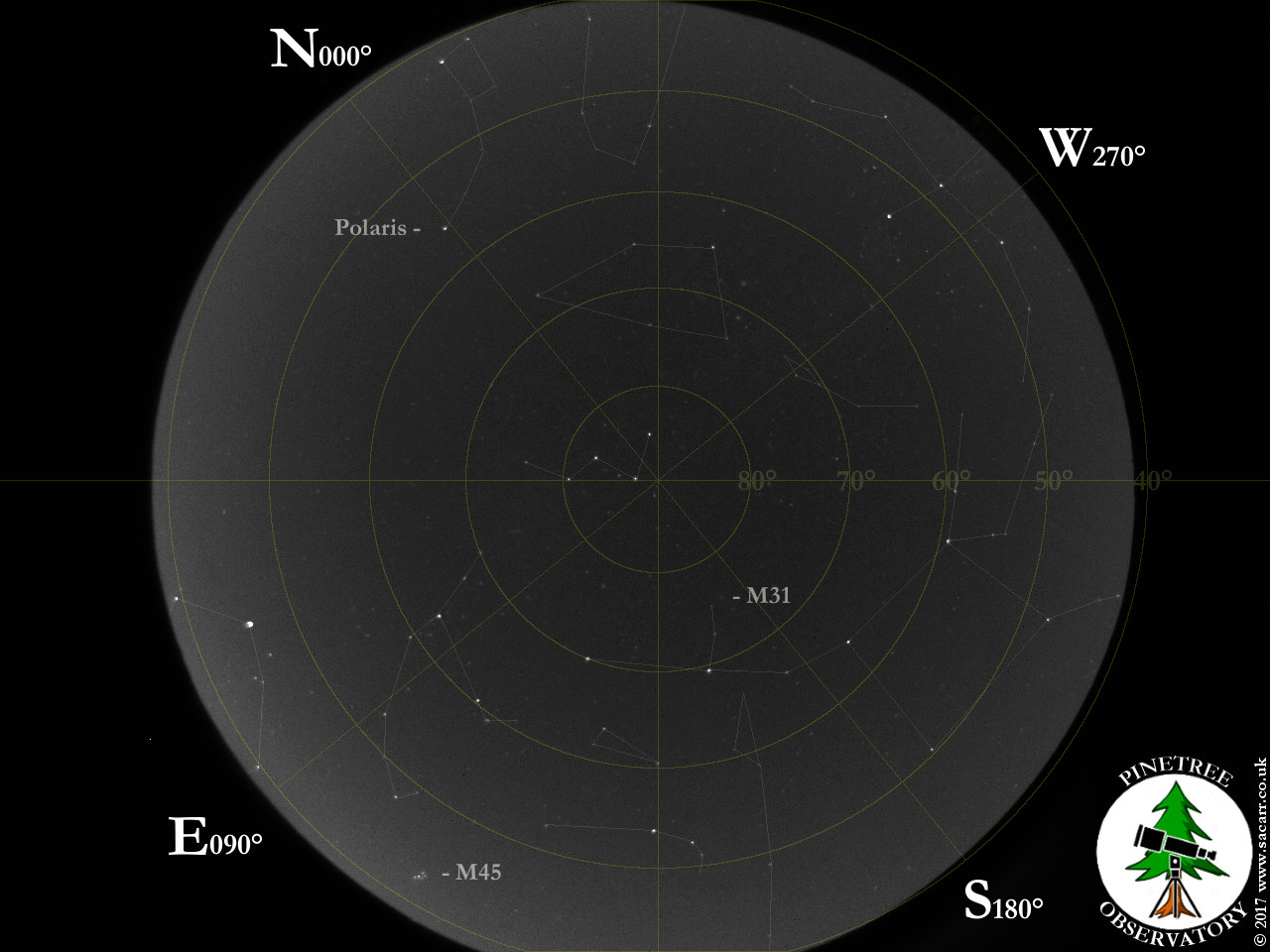 Sky Constellations This was the first capture of the night from a 6+ hour capture run, continuing until Sun rise. Many constellations can be identified in addition to M31, the Andromeda galaxy. This was the first proper test of the heated all sky dome, using waste CPU heat to provide the dew heating of the dome - 14-10-17