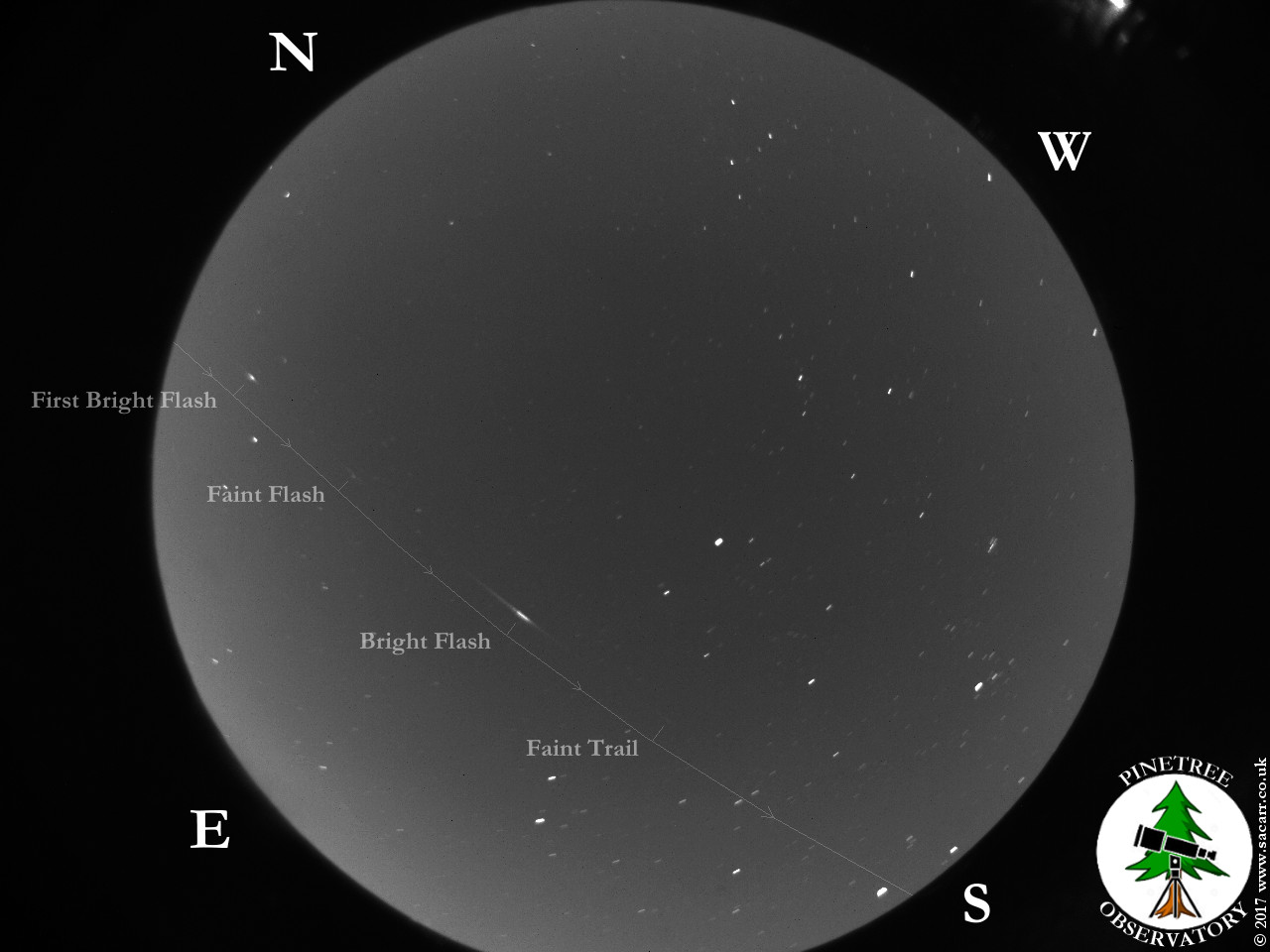 I spotted the bright flash on one frame when going through all the captures on the 15th. At first I thought it was a meteor capture until I examined the captures for a few frames either side. I then realised that it had left a trail on those too, and so had been in the sky for well over a minute; far too long for a meteor. It therefore was most likely to be a slowly spinning satellite, catching the Sun and brightening as it turned - 14-10-17