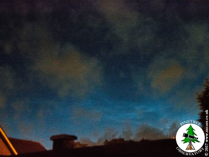 Noctilucent Clouds I saw a post on Facebook about NLC's forming, so went out with my DSLR handheld. Due to being hendheld, and hence a short exposure, the ISO was very high, and even with noise reduction on, the image was still very noisy - 15-06-17