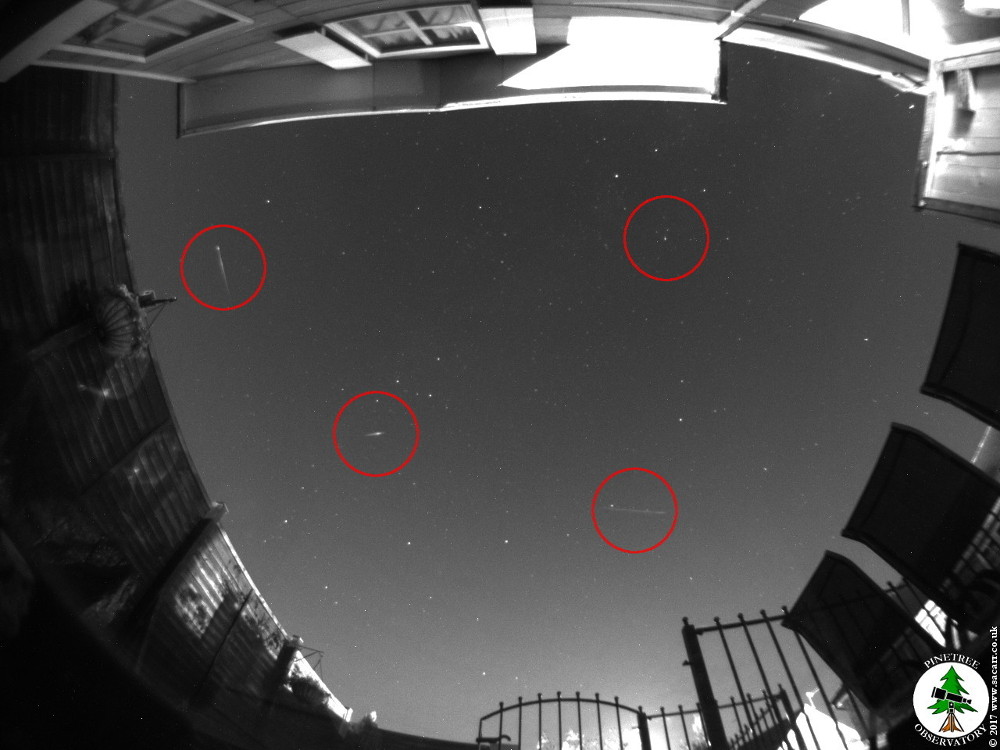 Four meteors from Saturday night into Sunday morning. Due to the light pollution and 3/4 Moon, only the brightest meteors were picked up by the camera. For Saturday evening, the camera was left on the patio looking vertically and was left running all night. Exposures were 15 seconds long with the gain at 40% - 13-08-17