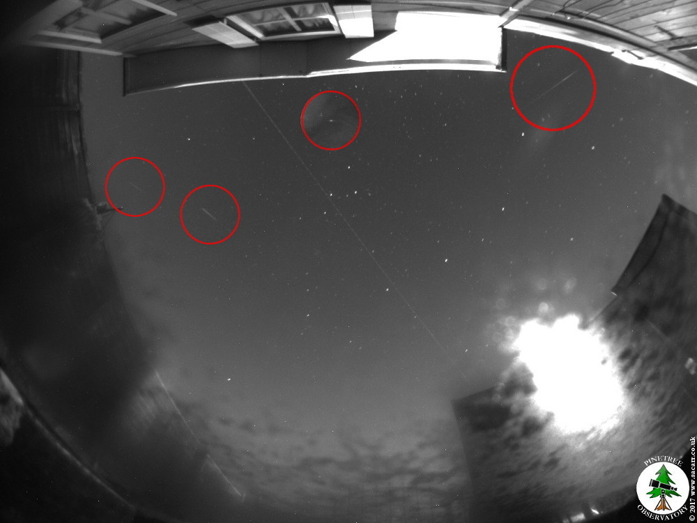 Four more meteors from Sunday morning, plus a satellite trail. Due to the light pollution and 3/4 Moon, only the brightest meteors were picked up by the camera. For Saturday evening, the camera was left on the patio looking vertically and was left running all night. I tried to shield the camera from the Moon with the garden chairs, which partially reduced the glare. Exposures were 15 seconds long with the gain at 40% - 13-08-17