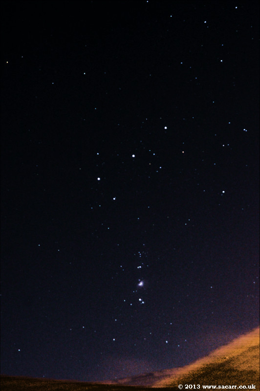 The Orion Nebula, Sword and Belt Around 4 minutes widefield with a 55mm lens, taken in 30 second subs between clouds.