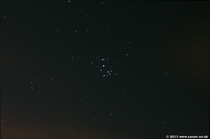 A heavily cropped M45 taken widefield with a 55mm lens on the DSLR. Around 4 minutes of exposure in 30 second subs between clouds.