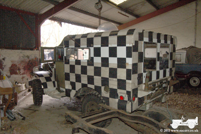 | While the Dodge idled as I warmed through the engine and tested that it wasn't going to stop again, I refitted the rear doors and side panels which are now virtually complete. There's still a couple of small jobs to do next time the truck is home. The first is some 'L' section aluminium to be fitted over the top of the doors to form a gutter, and also some 'L' section to be fitted at the bottom of the doors to make a gutter just above the tailgate to stop rain running down the doors and into the back of the truck. The other thing is to then wipe over the white checkers with an oily rag to dull them down like the rest of the truck. | |