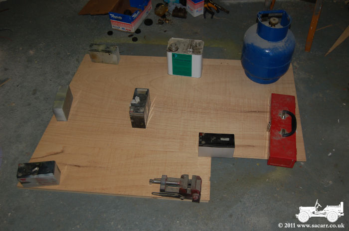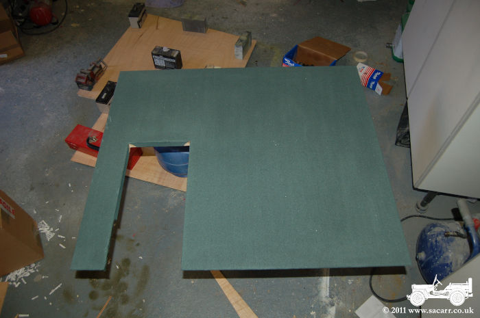 The second picture shows the bottom half of the two part drivers side door. The cut out in this door will have a smaller door in it, which will open to clear the spare wheel bracket as the main door opens. This small door can be seen in picture three. I didn't want the doors to be wood painted checkered, as I quite like the look of the current doors, so decided a canvas finish was the way to go. The door is covered in a thin canvas, stapled onto the frame, and then glued down with dilute PVA glue. This will be painted a more appropriate canvas colour once the doors are complete. |