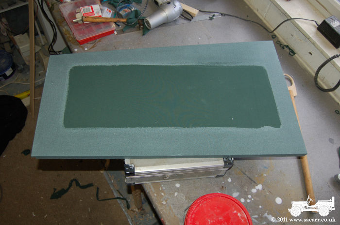 | Picture four shows the top of the drivers side door, with the canvas stretched over and glued in place. The window opening has already been cut out of the wood. Once dry, the canvas will be cut out of the window area, and glazing fitted. | |