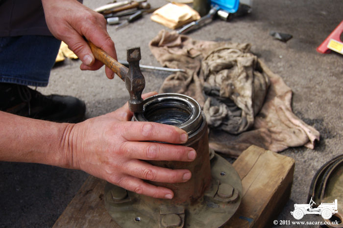 While at the Wheels & Wings show at the weekend, I noticed the rear axle oil seal on the right side was leaking badly, so ordered spares for both sides when I got home. The parts came mid week, so today Mike and myself got on with the job of changing the leaking one. Because rain was forecast, we just got the leaking one changed. It did however go very easily. After using the old seal as a drift to get the seal started into the hole, I made a 1/2 inch ply drift so it could be knocked all the way in without risk of damage. From the marks on the old seal, it appears it was knocked in with a screwdriver. The front left hub was also removed as that is slightly oval and has been binding. That has gone away to be skimmed, and the front four shoes have been removed to be relined. |