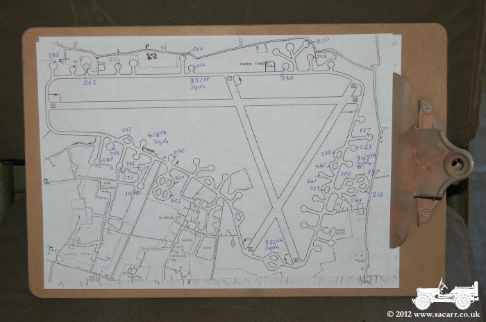 | Following on from the discovery of some original flying control documents, I've produced some paperwork to display in the back of the Dodge. The first is an airfield plan, with the aircraft serial numbers noted next to the dispersals. This is pure speculation, but is there to show people the expanse of a heavy bomber base. The second is a weather map, almost a direct copy of a vintage Atlantic/Europe chart, which I figured should hang next to the Meteorological instruments. | |