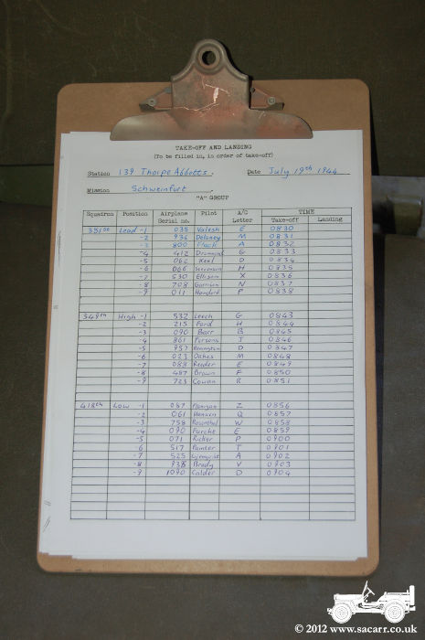 | Document 3 is an order of take off, copied/re-produced from a tiny version found in one of the Roger Freeman 8th Air Force books. It shows the take off order, squadron and position, a/c serial & code letter, pilot, and take off time. 4th is from a hand written record from the 100th Bomb Group archives, showing radio frequencies, code words and flare colours for a mission. Lastly, also from the 100th BG, is a re-production of a hand written, un-official log from the flying control officer at Thorpe Abbotts, recording everything that happened on the flightline/runway across the day. | |
