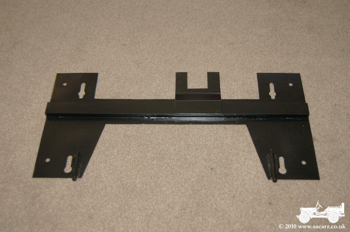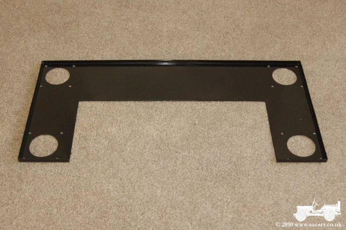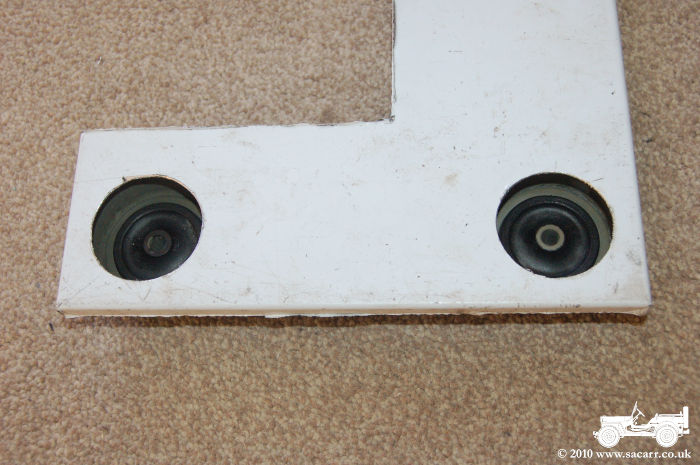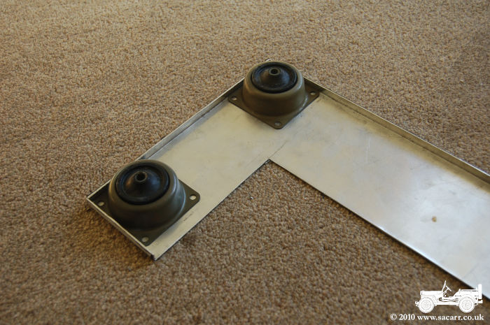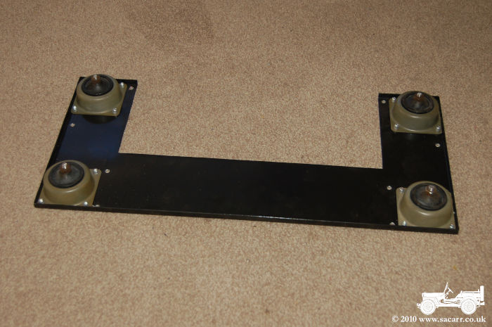 | Below, the rubber mounts can be seen through the underside of the mount base plate. The rubber mounts will be riveted in place after painting of the tray is complete. The top side of the base has been painted and is now curing. | |