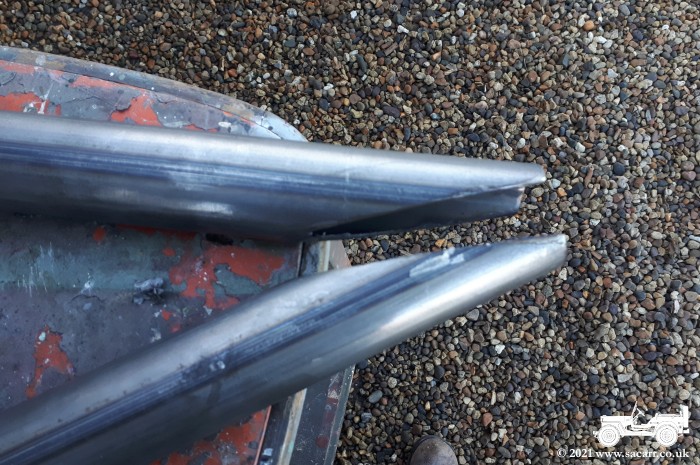 After a quick check that the hinge plates were clear of the bolt holding the floor frame to the floor, the hinge plates were welded into the A-Frame bars. This allowed them to be temporarily mounted to the hinge mounts with some studding. With the bars fitted in the truck bed, the top ends were pulled together to work out the taper angle that they would need to be cut to, in order to fit the frame head. The cut lines were marked with masking tape. |