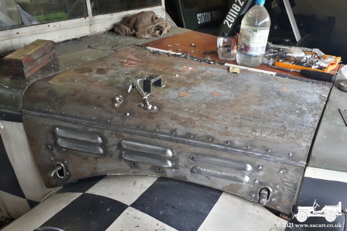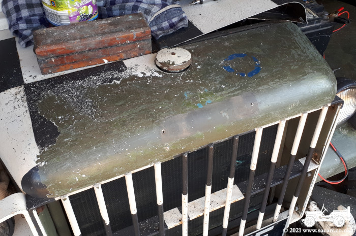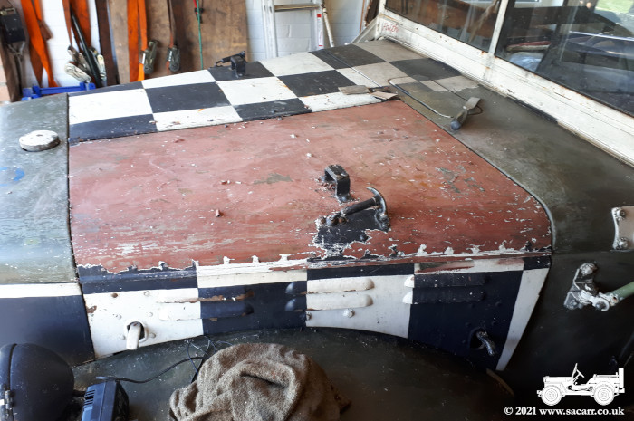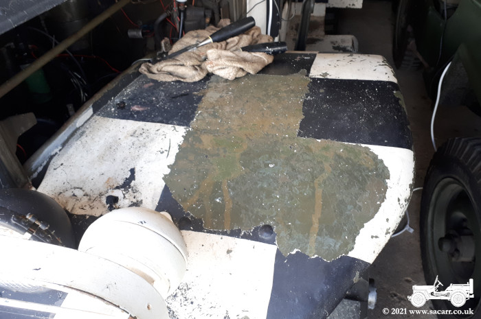 | The following day, I began work on the main section of the hood. I'd repainted this some years ago due to rust patches. The black and white didn't want to chisel away from the olive and in places, even the primer lifted. The paint was very hard and wasn't in the mood to be chiseled! However, having been decorating recently, I decided to give the wallpaper steamer a go. It had worked well to remove emulsion paint from a wall, so perhaps it could do the same for the checkers, which were also emulsion. Back when I did the rust repairs, I'd only given the area a thin coat of olive paint as it was going to have checkers over the top anyway. The steamer brought off the black, white and olive fairly easily, in most areas leaving the primer behind. The side of the hood was going to be
