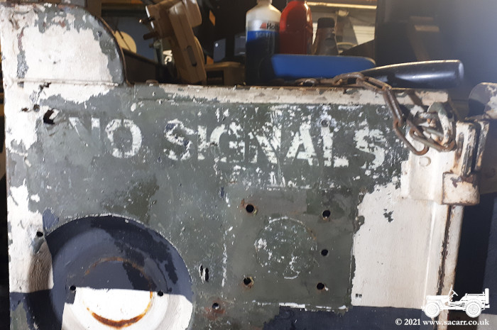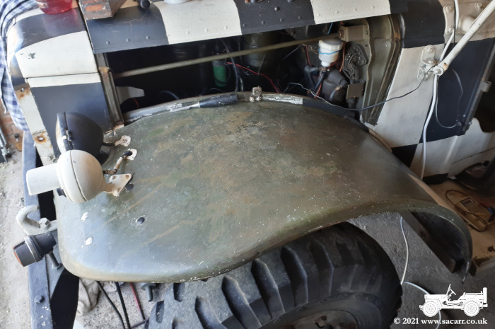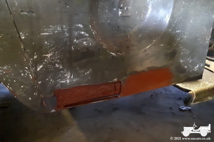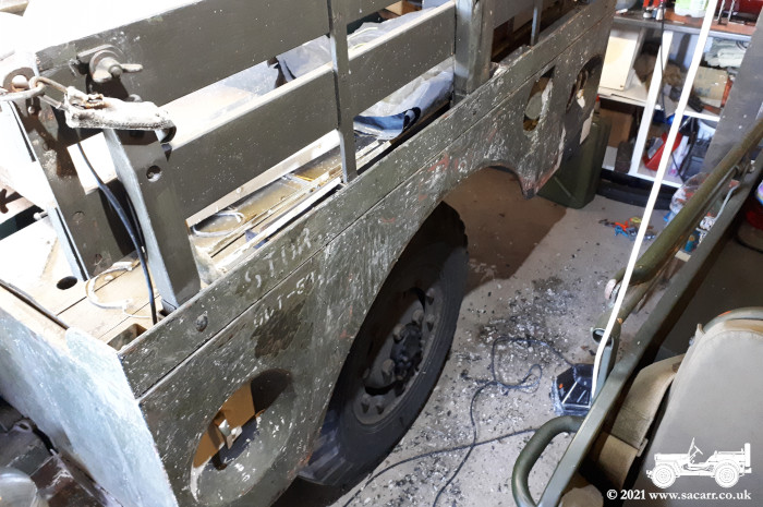 It's still a tight squeeze to work in there, but by moving the GPW backwards a little, it gave a bit more room at the rear right corner where I have some welding to do. I carried on stripping the fender first, uncovering some shipping data stencils. They appear to be on a more recent layer of paint, so probably applied by the Norwegian collector and not original. |