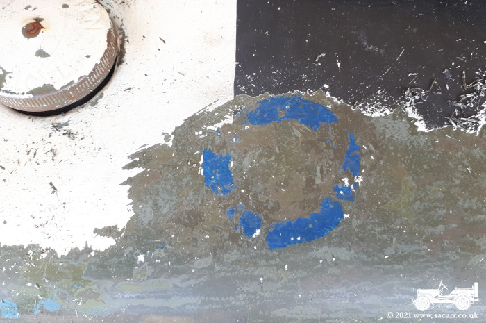 | On the 17th, I began stripping the checkered paint from the Dodge. A few days ago, I did a test with a chisel, chipping away at the paint and lifting it in flakes. This would be quicker than trying to sand through the black and white layers. The green below could then be lightly sanded to key the surface for a new olive drab paint layer. While scraping near the radiator cap, I found the blue circular marking seen below. I suspect this may have been something from Norwegian army service, but can't be sure. |