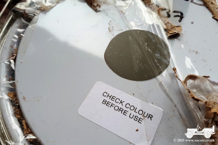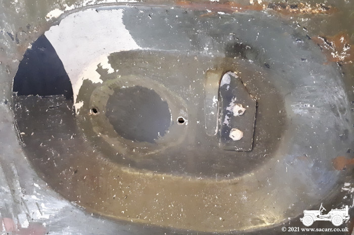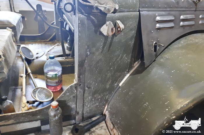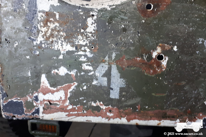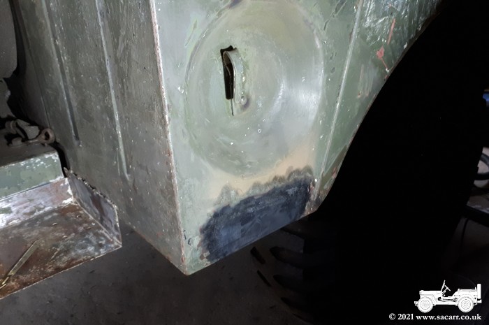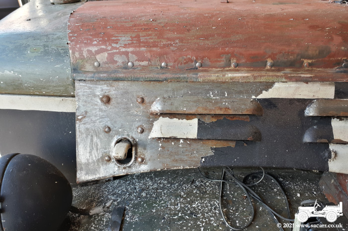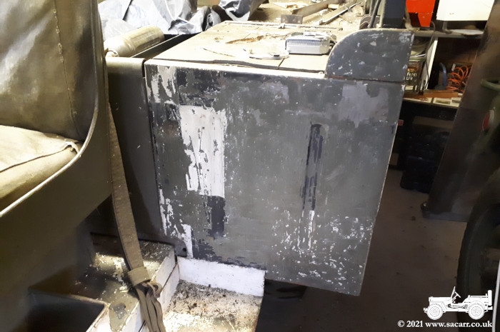 | The steamer had worked really well on the hood, so I gave it a try on the rear body, starting at the front. It wasn't long before I found some lettering, which once uncovered, read " STOR. " and below it, " OCT-53. ". These words weren't on the lowest layer of paint, so I'm guessing they date from Norwegian Army service. I continued rearwards until reaching the back, then chipped out the paint from the fuel filler and canvas tie depressions. That's the progress so far - almost one side completely stripped. |