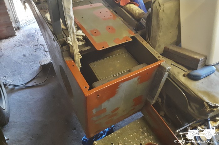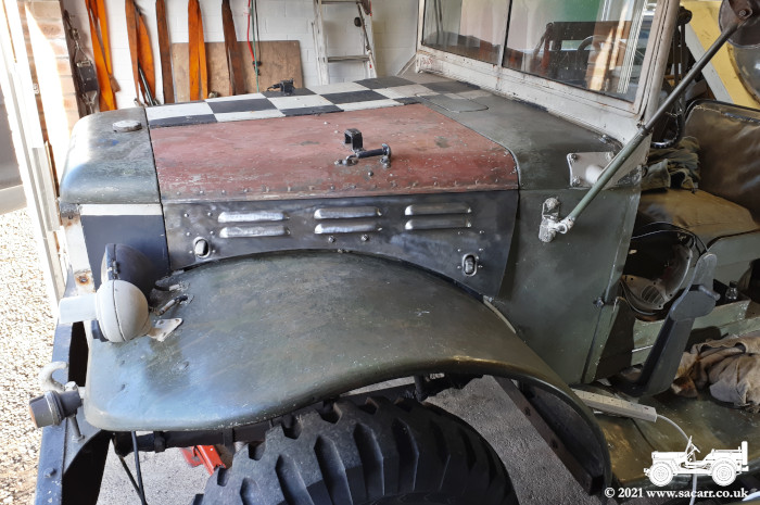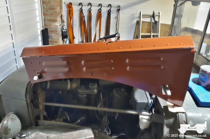 | On the 30th, I started stripping paint from the screen. It turned out that the inner frame was another area without any primer and the paint flaked away very easily. A little chipping on the outer frame showed it was primed and the paint was more stubborn to remove. Due to the difficult shapes, the wiper motors and the inner frame needing some rust treatment, I decided removing it and moving it to the workshop was the most sensible move. I'd have more space to work on it there. With the screen off and out of the way, it left the cowl over the instrument panel easy to reach and so the remains of the paint, which had been under the screen, was stripped off. Some areas were wire brushed, the whole area sanded and a number of areas primed, along with some small fixings from the screen. The right side of the body was next, sanding paint and grinding rust spots and quite a lot of slight surface rust. So much of the body was stripped to metal, that after sanding the remains of the paint, the whole side of the body was red oxide primed. With the colder and more damp weather coming, I may finish the welding on the fenders and then get on with the painting of the olive drab. I can get the garage fairly warm with a heater and the paint can bake. The olive drab can then be left to harden fully while I work on the windscreen. By the time that is painted and can be refitted, the truck paint should be hard enough to climb over for the screen fitting. |